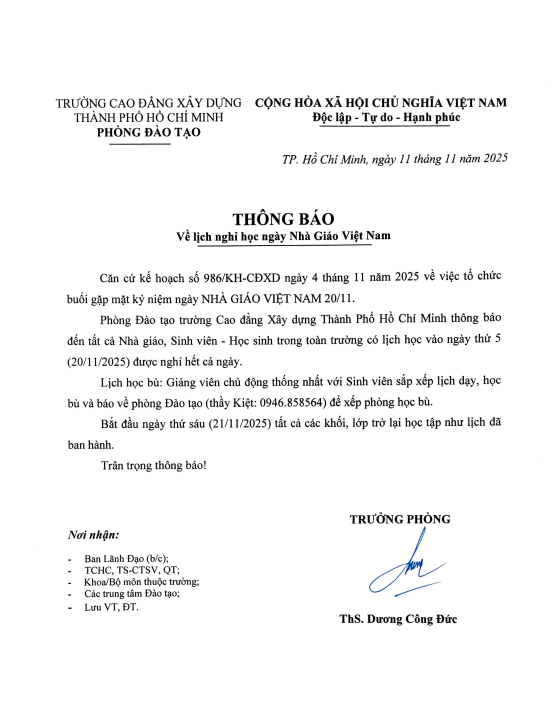 Thông báo nghỉ lễ Nhà Giáo Việt Nam 20/11/2025